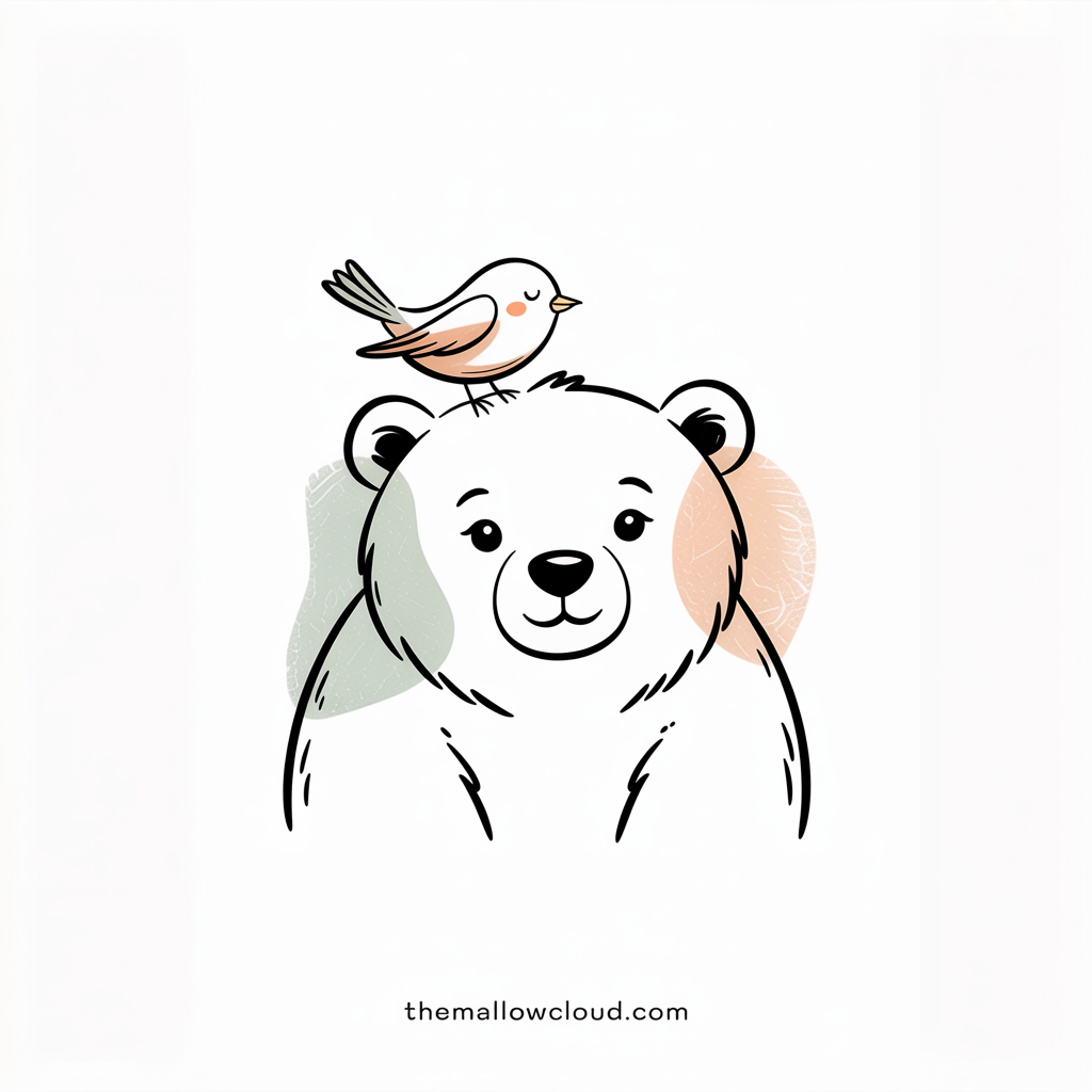 - Sketch a tiny bird shape with a small oval and triangle beak on the bear’s shoulder.