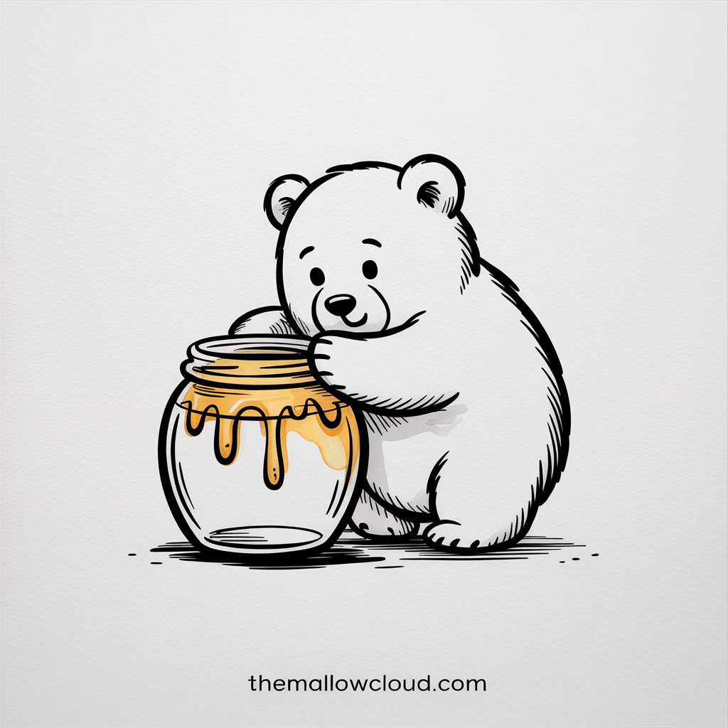 The idea works because it combines the bear’s sweetness with a familiar motif. The honey jar adds color contrast if you choose to fill it in. The interaction between bear and jar tells a small story, making the scene feel lived-in. It’s both cute and expressive without needing many strokes.