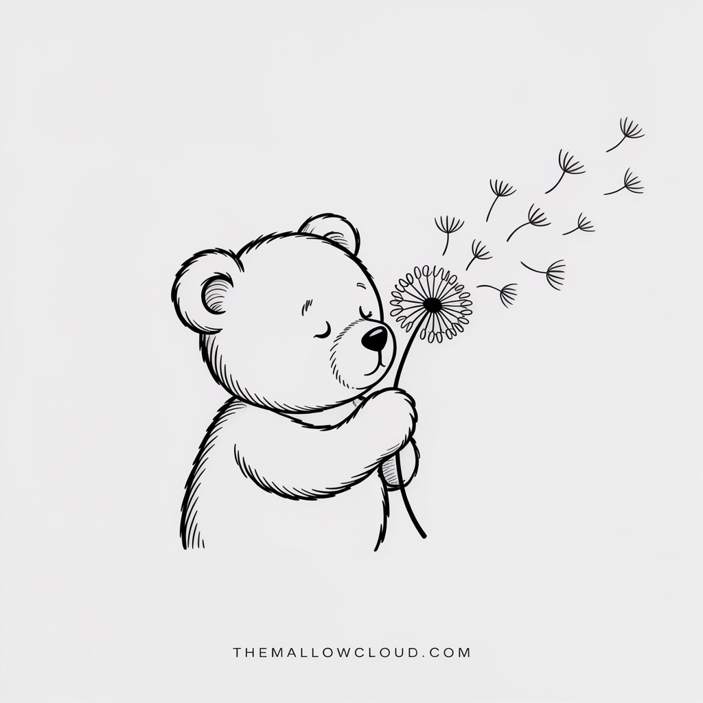 Pair a bear with a dandelion puff to capture a moment of gentle interaction. The bear can hold the stem and blow the seeds into the air. Each seed can be a tiny line with a dot at the end. It creates a sense of lightness and wonder on the page.