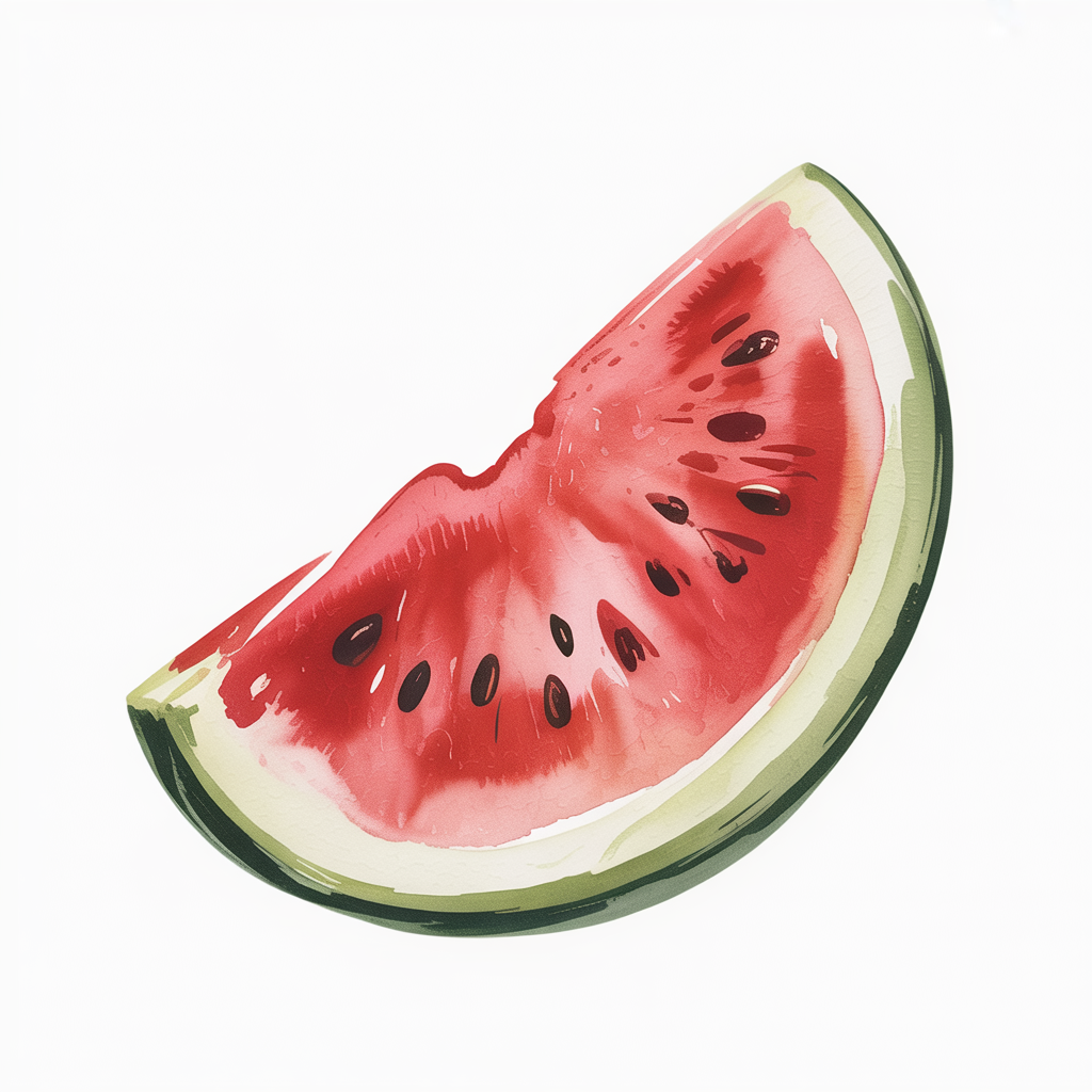 A slice of watermelon reveals a vibrant red center and a green rind. The contrast between colors makes it visually striking yet balanced. Small black seeds add detail.