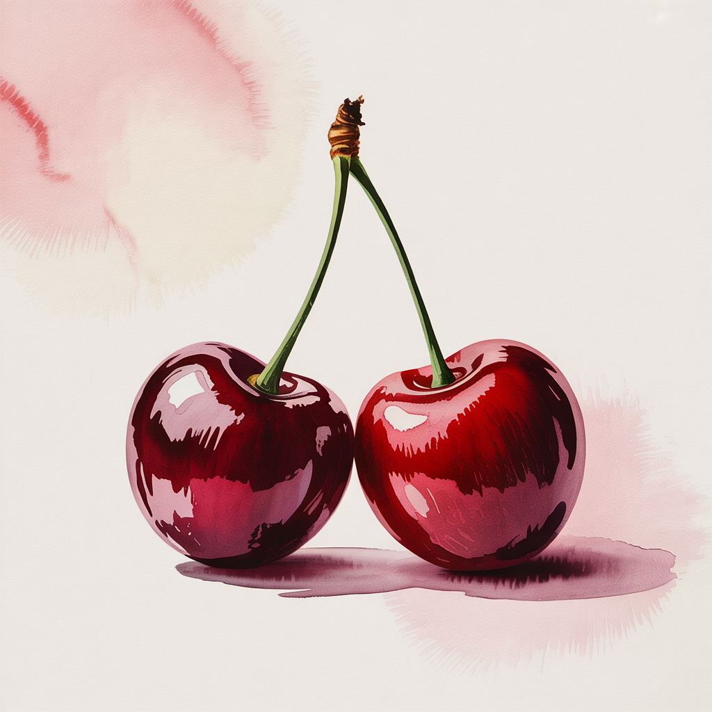 Cherries feel playful and decorative. Their glossy surface reflects light beautifully. Deep red tones combined with small white highlights create a shiny effect.