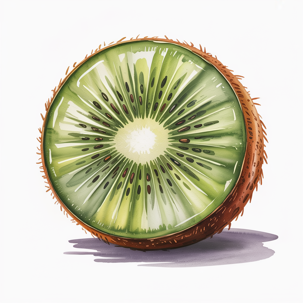 The kiwi stands out with its bright green center and tiny seeds. A mix of green tones and dark dots creates an interesting texture. The outer skin can be suggested with rough brush strokes.