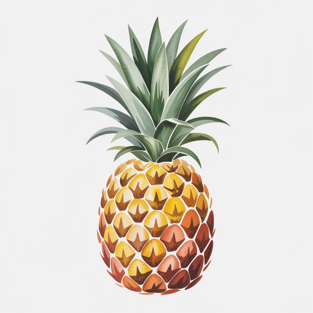 The pineapple stands out with its bold texture and leafy crown. It adds an exotic touch to your composition. Warm yellow and brown tones create a rich base, while green leaves add contrast.