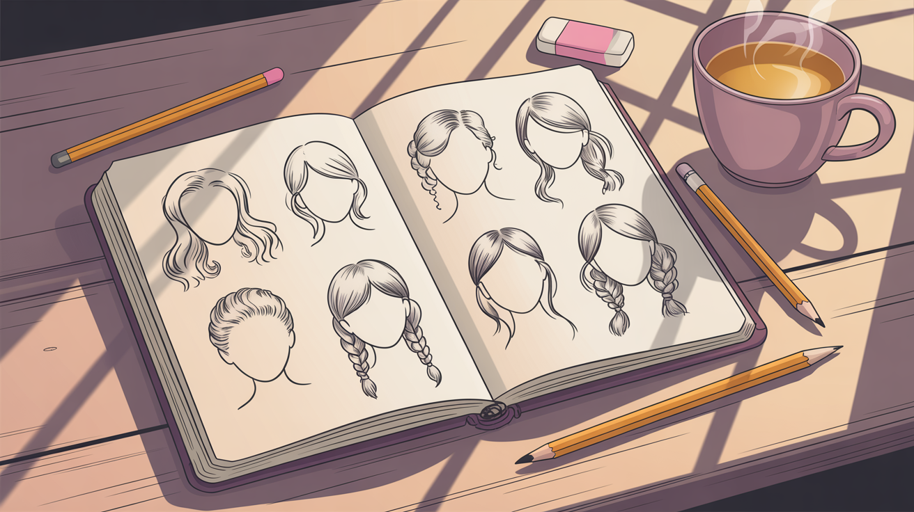 Morning light filters through the curtains, casting gentle shadows across the sketchbook spread on your desk. Sketching hair can feel like chasing individual strands in a breeze, while your mind seeks a calm rhythm. In this quiet corner, a single pencil can capture the dance of light and flow on each lock. Let the sound of leaves from the garden outside guide your hand as you explore subtle curves and natural movement. Embrace the simplicity of minimal lines and soft shading to bring each hairstyle to life.
